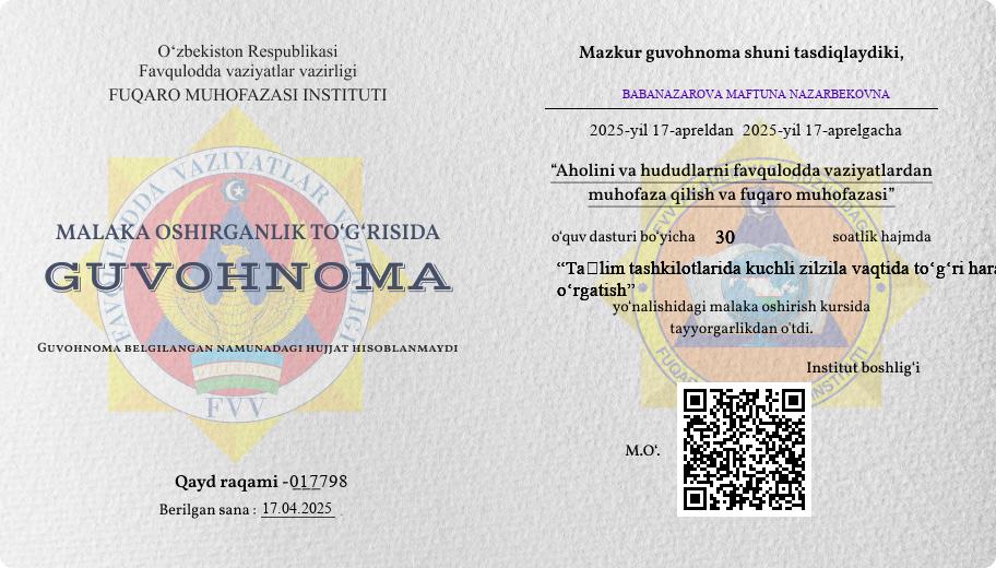 Бабаназарова Мафтуна Назарбековна — талантливая и целеустремлённая личность, сочетающая в себе научный потенциал, педагогическое мастерство и богатый культурный багаж. Родившись 28 мая 1997 года в городе Навои, она с раннего возраста демонстрировала стремление к знаниям, искусству и развитию. Своё образование Мафтуна Назарбековна начала в средней школе №4 города Навои, которую успешно окончила в 2013 году. Далее она получила медицинское образование в Навоийском медицинском колледже (2013–2016), где приобрела глубокие знания и дисциплину. В 2017 году начала путь в сфере педагогики, став студенткой Бухарского государственного университета, а в 2021 году поступила в магистратуру Бухарского государственного педагогического института, где в 2023 году успешно завершила обучение. Сегодня Мафтуна Назарбековна — исследователь и преподаватель кафедры начального образования Бухарского государственного педагогического института. Её профессиональная деятельность направлена на развитие методик преподавания и совершенствование образовательных подходов в начальной школе. Она активно занимается научно-исследовательской работой, участвует в образовательных проектах и внедряет современные педагогические технологии в учебный процесс. Помимо академических достижений, Мафтуна Назарбековна — разносторонне одарённая личность. В течение 7 лет она обучалась в музыкальной школе имени М.И. Глинки в городе Навои, где овладела искусством игры на фортепиано. Её музыкальное образование стало мощной основой для развития креативности, эстетического вкуса и эмоционального интеллекта — качеств, которые находят отражение в её преподавательской деятельности. Свободное владение русским языком позволяет ей эффективно коммуницировать, публиковать научные материалы и выступать на профессиональных площадках. Мафтуна Назарбековна — это сочетание интеллекта, культуры, педагогического призвания и стремления к постоянному росту. Она уверенно движется к вершинам науки и образования, внося весомый вклад в подготовку нового поколения школьников и будущих лидеров общества.