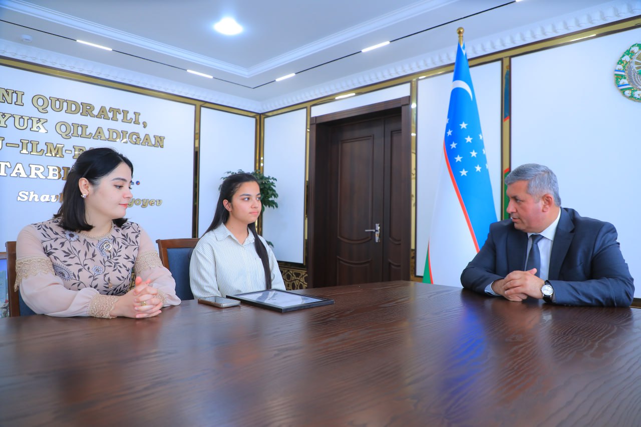 Buxoro davlat pedagogika instituti rektori Bahodir Ma’murov IELTS xalqaro til bilish (ingliz tili) imtihonidan 8,5 ball to‘plab, C2 sertifikati qo‘lgan kiritgan Tillar fakulteti 1-bosqich 3-XTA-24 guruhining iqtidorli talabasi Mohlaroyim Yaxyoyeva bilan uchrashdi.